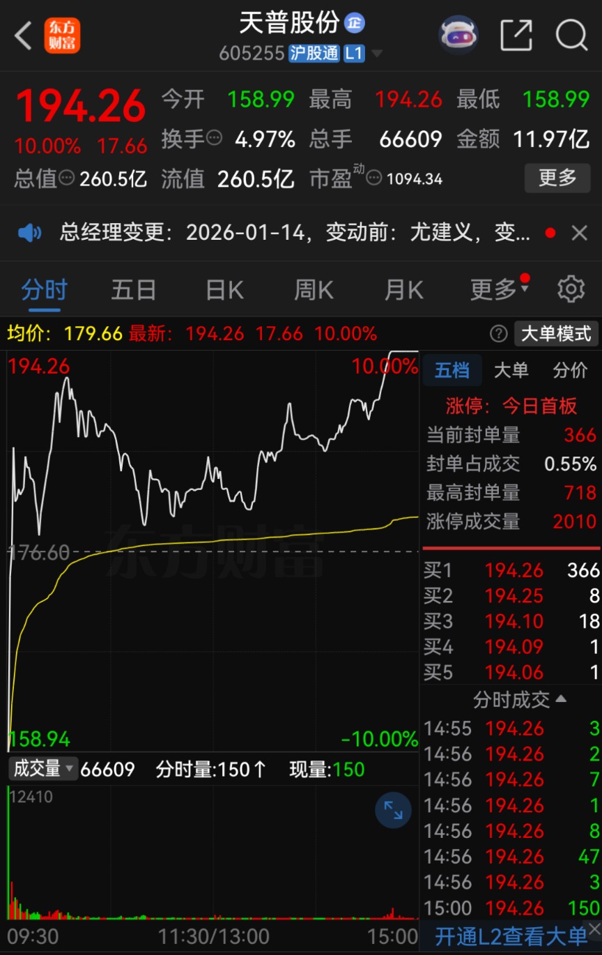 截至 1 月 14 日收盘,天普股份股价报 194.26 元/股,涨幅达 10%,总市值为 260.5 亿元。