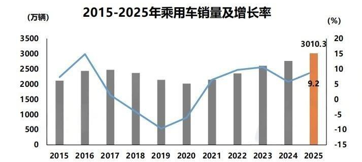 《每日经济新闻》 记者查阅中汽协发布的近十年 (2015 年至 2025 年) 来乘用车销量数据发现,2025 年,中国乘用车产销规模首次突破 3000 万辆大关。对于这一成绩,陈士华称,这是中国汽车史上的新纪录,远超预期。