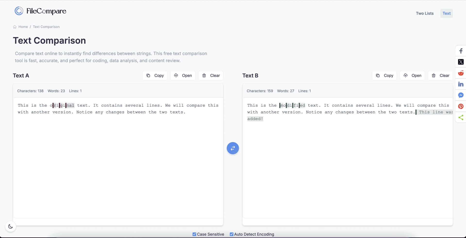 一个简单而强大的在线文本与文件对比工具。它能快速比对两个列表、文本片段或文件内容,精准标注出增加、删除或修改的差异。非常适合代码审阅、数据去重或文档校对工作。 https://filecompare.org 文章来源:w2solo