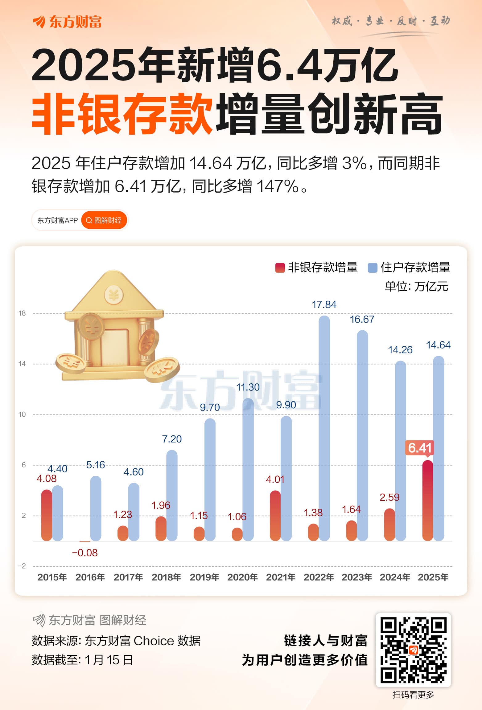 中国人民银行1 月 15 日发布的数据显示,2025 年非银行业金融机构人民币存款 (下称非银存款) 增加 6.41 万亿元,年度增量比上年大幅提高 147%,并且超过 2015 年的 4.08 万亿,创有统计数据以来新高。非银存款 2025 年末总额为 35.56 万亿。