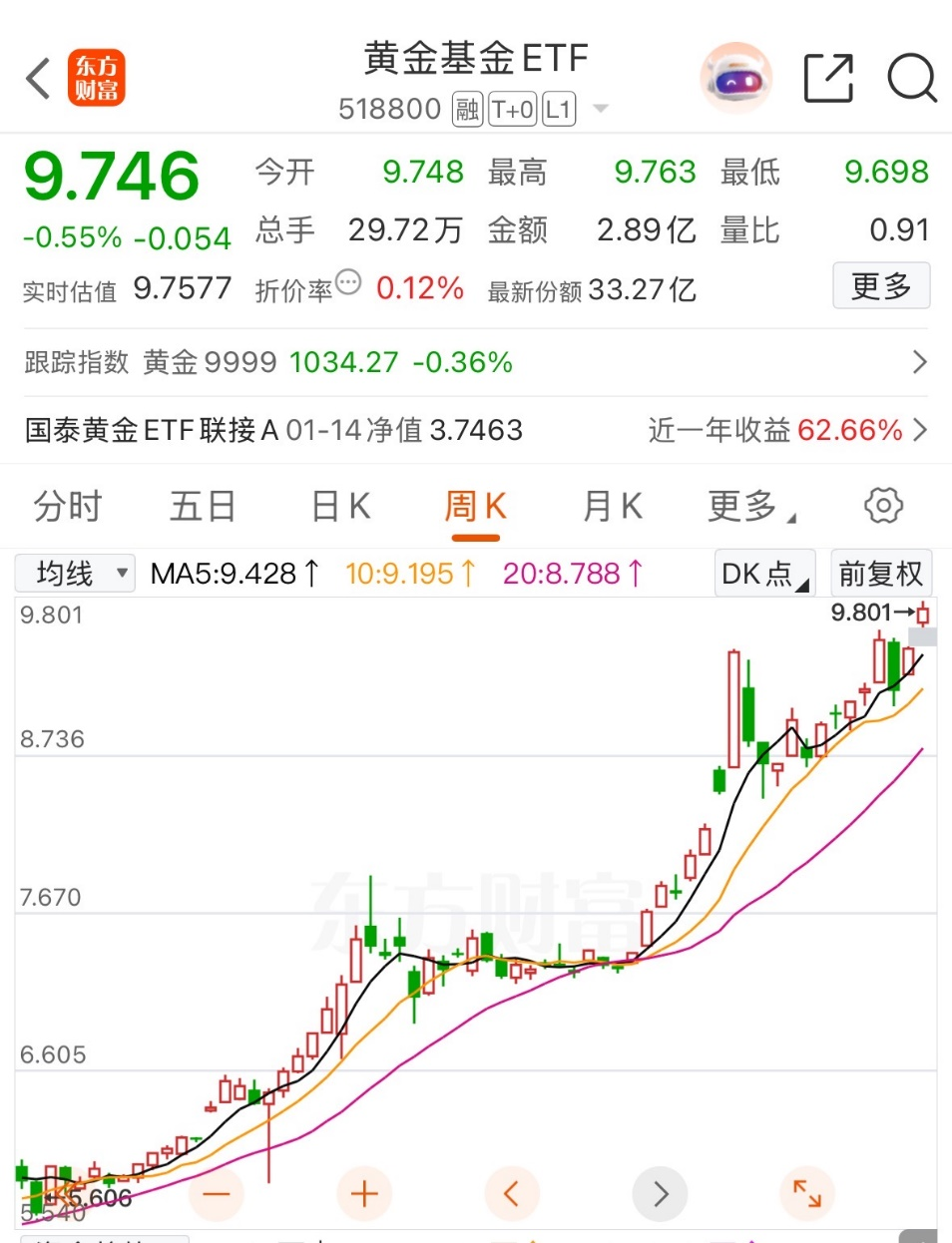黄金基金 ETF(518800) 是国内头部黄金 ETF,规模超 300 亿元,流动性活跃。其 90% 以上资产投资于上海黄金交易所 Au99.99 实物黄金,跟踪金价精准,综合费率低至 0.6%/年。近期随金价走强表现亮眼,连续多日获资金净流入。