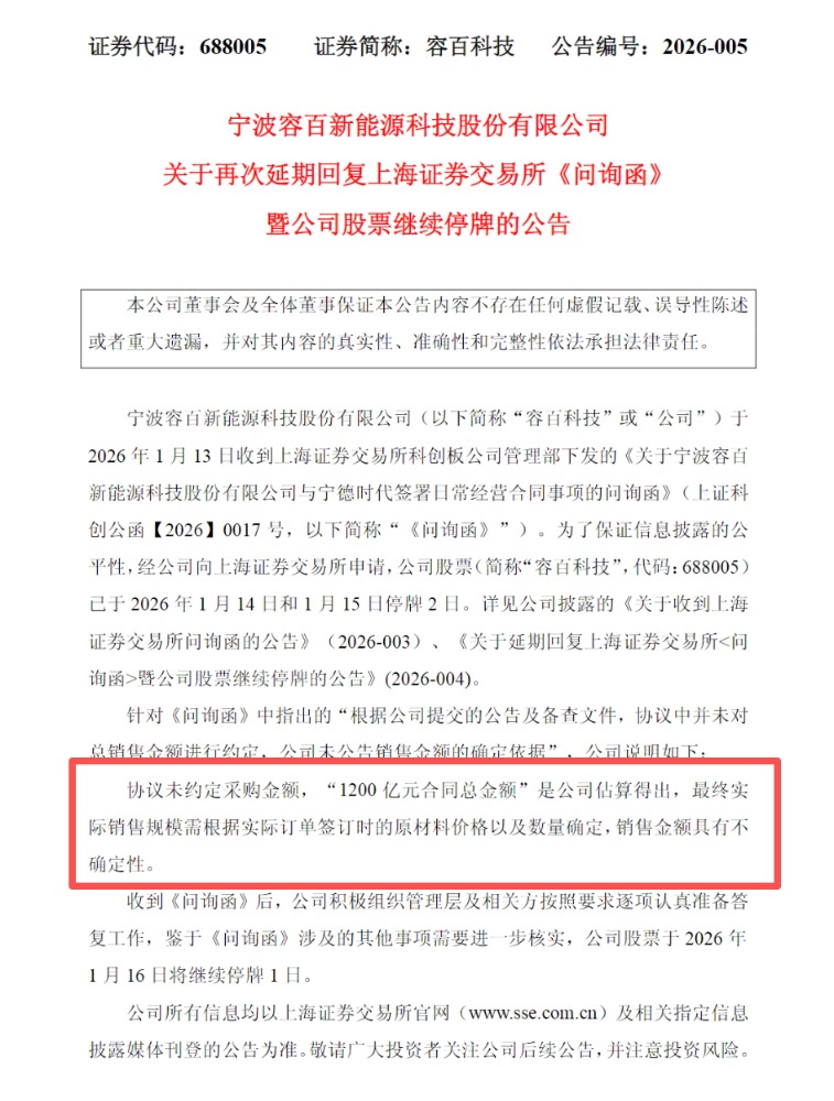公告中,容百科技表示鉴于 《问询函》 涉及的其他事项需要进一步核实,公司股票于 2026 年 1 月 16 日将继续停牌 1 日。
