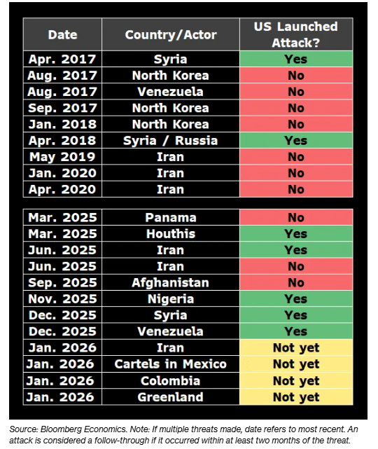 根据彭博经济研究首席地缘经济分析师珍妮弗·韦尔奇 (Jennifer Welch) 的分析,在特朗普的第一个任期内,他兑现了所发出威胁的约 40%。而在其第二任期迄今为止,这一比率已升至 60%。