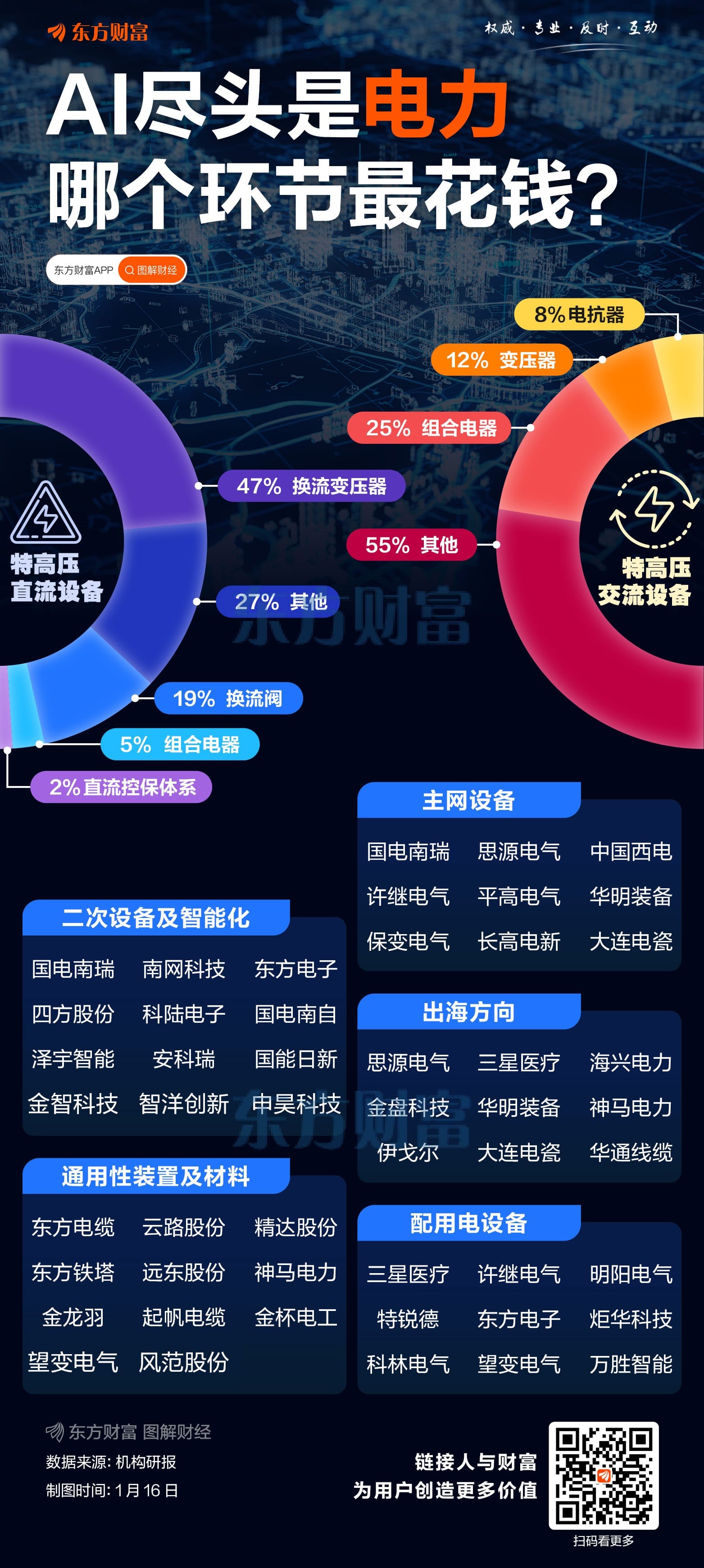 从机构研报观点看,按照使用场景,电网设备分为特高压直流 (跨区域电力输送) 与特高压交流 (区域电网支撑)。主要设备包含变压器、阀门、组合电器、控保系统、电抗器等。
