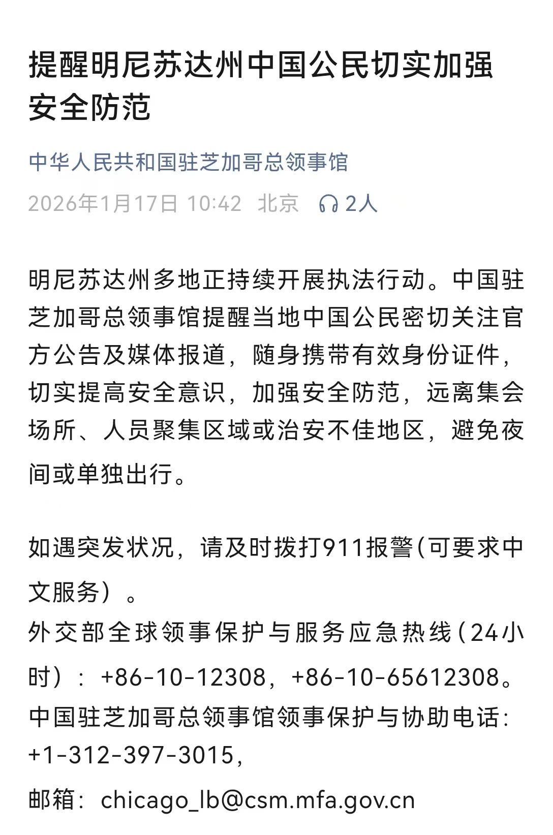 中国驻芝加哥总领事馆官微 1 月 17 日发布提醒,提醒在明尼苏达州的中国公民加强安全防范: