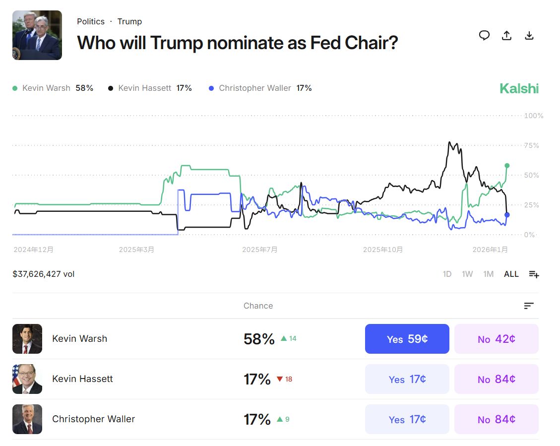 在预测平台 Kalshi 上,交易员大幅提高了沃什胜出的押注,使其明显领先此前被视为最主要竞争对手的哈塞特。数据显示,截至 17 日 09 点 35 分,沃什获得美联储主席职位的概率已升高至 58%,而哈塞特的概率则降至 17%。而在本周三,沃什与哈塞特在预测市场中的胜算还几乎不相上下。Polymarket 上的数据也同样显示,沃什以 56% 的概率领先,哈塞特仅为 16%。