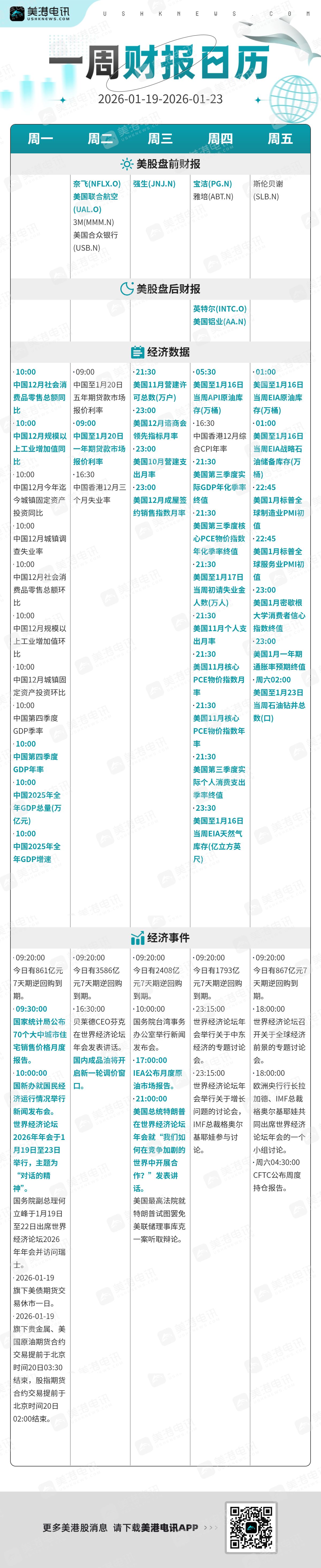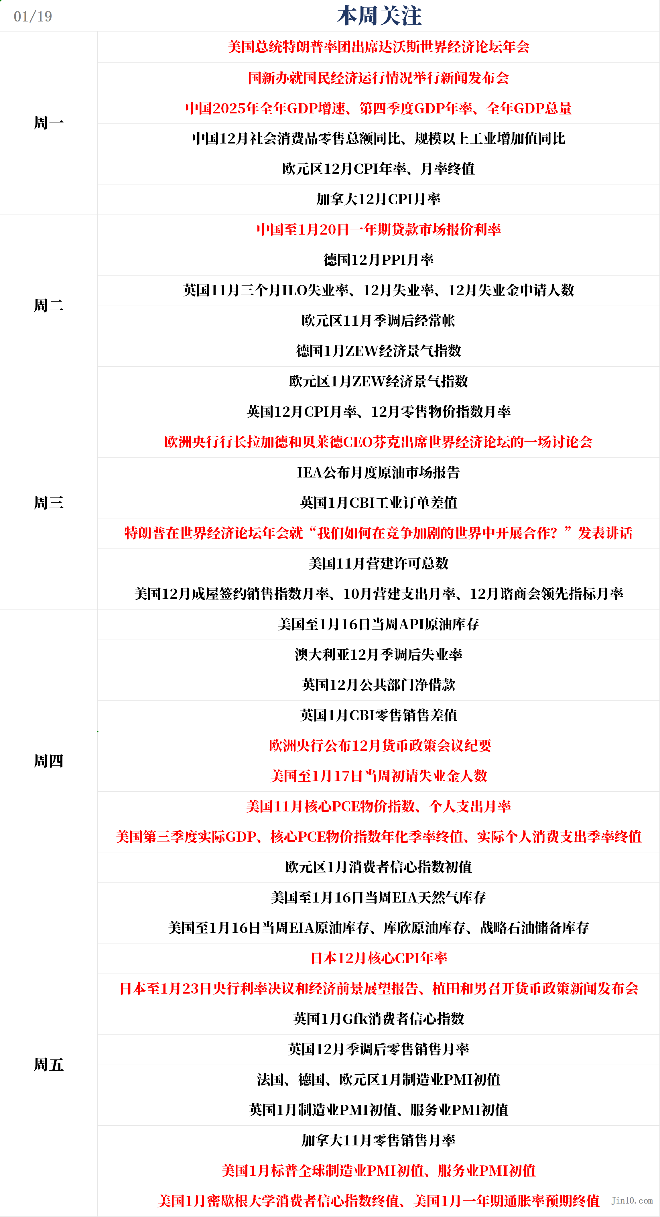 瑞士达沃斯世界经济论坛的核心价值观——协调全球经济秩序——正面临考验。特朗普预计将出席,他的关税政策、对委内瑞拉的军事干预以及收购格陵兰岛的威胁是否会成为讨论议题将是一大看点。 此外,任何关于他与鲍威尔之间纠葛的言论都可能引发市场高度关注。