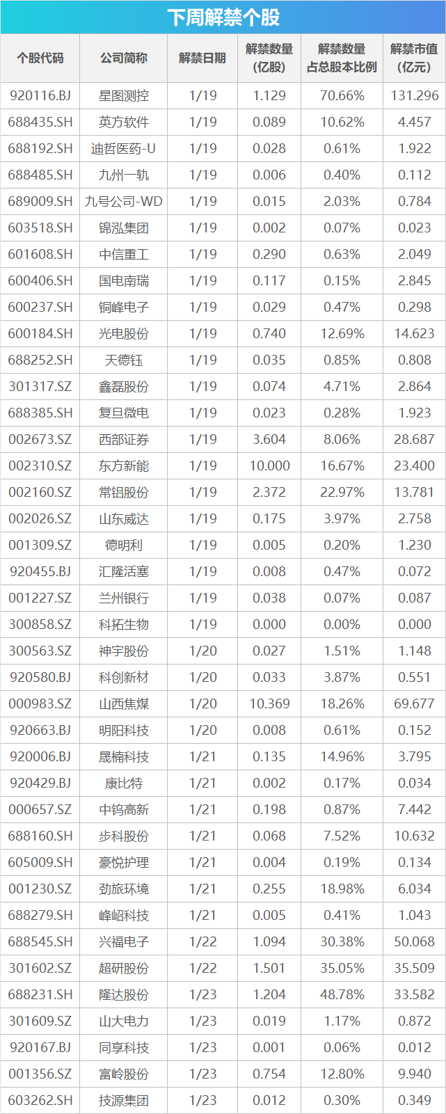 Wind 数据显示,下周 (1 月 19 日-1 月 25 日) 共有 39 家公司限售股陆续解禁,合计解禁 34.47 亿股,按最新收盘价计算,合计解禁市值为 464.99 亿元。