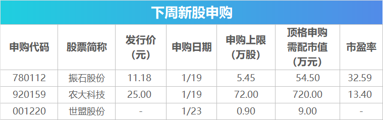 具体来看,振石股份、农大科技将于 1 月 19 日开启申购,振石股份申购代码为 780112,发行价为 11.18 元/股,农大科技申购代码为 920159,发行价为 25.00 元/股。世盟股份将于 1 月 23 日开启申购,申购代码为 001220。