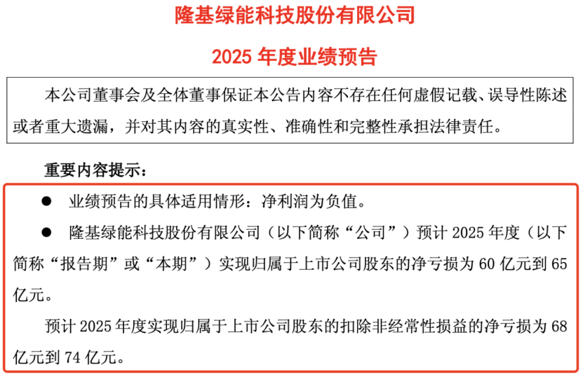 1 月 18 日,隆基绿能发布业绩预告称,预计 2025 年度实现归属于上市公司股东的净亏损 60 亿元到 65 亿元;预计 2025 年度实现归属于上市公司股东的扣除非经常性损益的净亏损为 68 亿元到 74 亿元,亏损金额有所缩减。