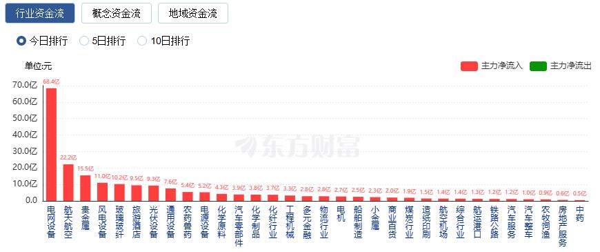 行业资金方面,截至收盘,电网设备、航天航空、贵金属等净流入排名靠前,其中电网设备净流入 68.43 亿。