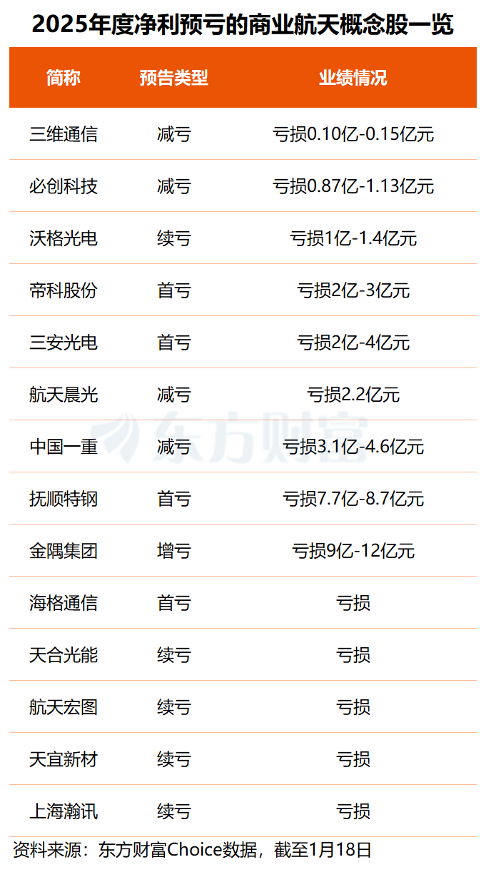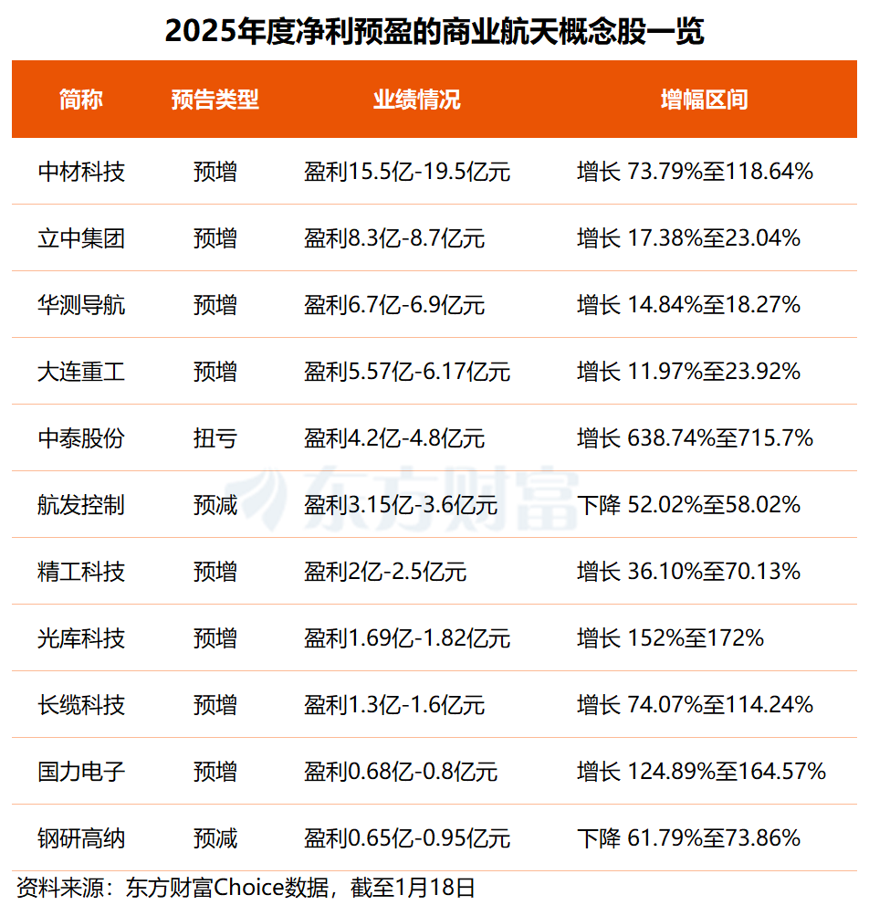 东方财富Choice 数据显示,截至 1 月 18 日,已有 25 只商业航天概念股披露 2025 年度业绩预告,其中有 11 股预计实现归母净利润盈利 (9 股预增、2 股预减),中材科技去年净利预盈 15.5 亿至 19.5 亿元居首,立中集团、华测导航分别预盈超 8.3 亿元和 6.7 亿元。