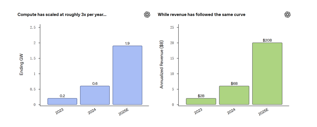 据弗莱尔介绍,2025 年 OpenAI 的计算能力同比增长三倍,2023 年至 2025 年增长 9.5 倍,收入也呈现同样的增长趋势,同比增长三倍,2023 年至 2025 年增长 10 倍。