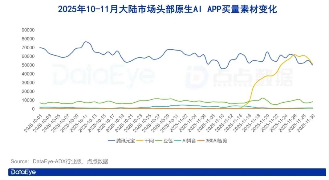 据 《财经》 报道,直至 2025 年 10 月,阿里的通义 App(千问 App 前身) 一度月活跃用户仅有 300 万,在大厂中几乎垫底。但 2025 年 11 月之后,千问 App 迭代明显加速,C 端月活跃用户超过 1 亿。DataEye 数据显示,千问 11 月投放量暴涨 13726.1%,一度反超元宝。