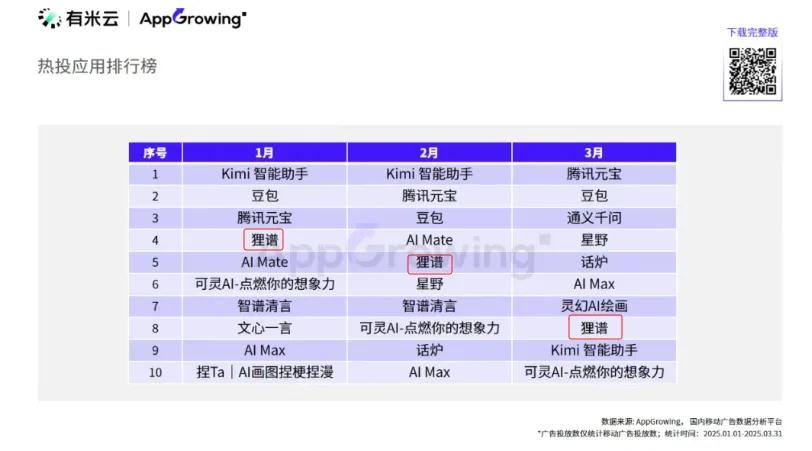 狸谱 2025 年 1-3 月投放量均位居热投应用排行榜前十