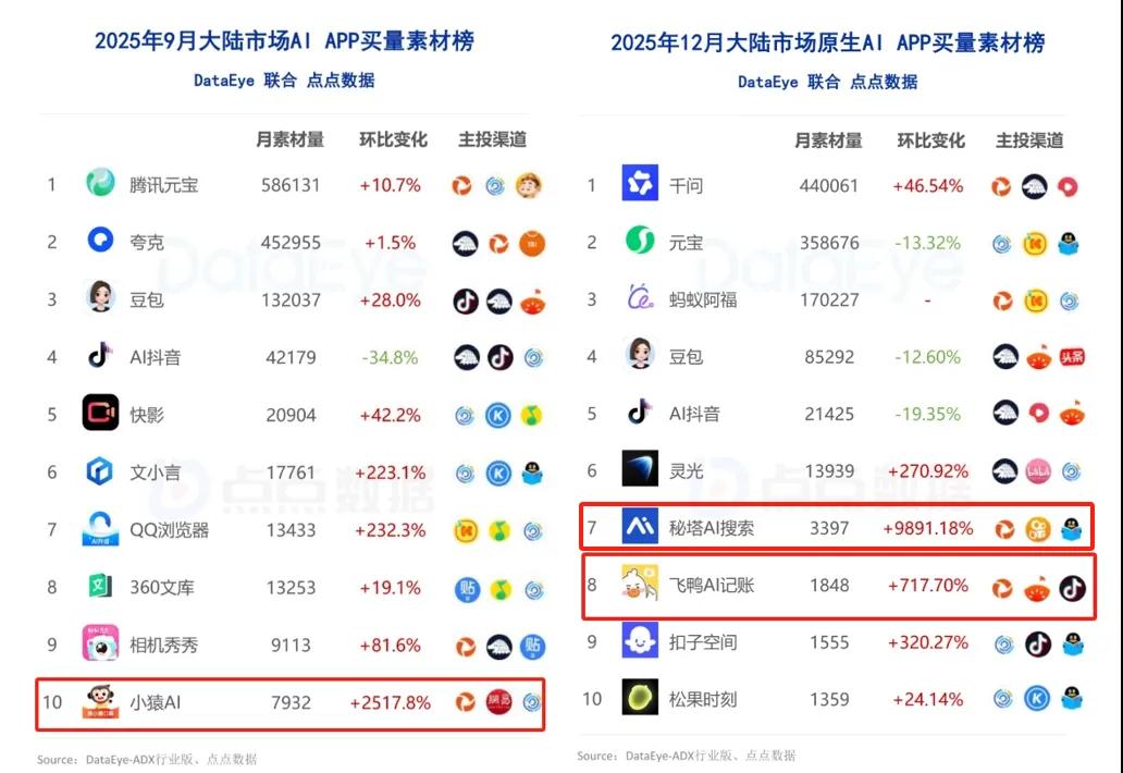 数据显示,瞄准二次元领域的狸谱 2025 年 1-3 月投放量均位居前十;猿辅导的小猿 AI 则在 9 月开学季投放素材量暴涨 2517.8%;此外,记账类应用飞鸭 AI 记账在年底突然冒出,12 月投放素材量同比大涨 717.7%;专注 AI 搜索领域的秘塔 AI 搜索也在 12 月突然发力,投放素材量环比大涨 9891.18%,跻身月度买量榜第七。