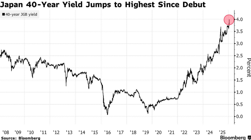日本 40 年期国债收益率触及 4%,为 2007 年该券种推出以来的最高水平,也是该国 30 多年来任何期限主权债收益率首次达到这一水平。