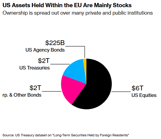 欧洲各国持有数万亿美元的美国国债和股票,其中部分由公共部门基金持有。鉴于美国对外国资本的依赖,这引发了人们的猜测:为回应特朗普重启的关税战,欧洲可能抛售此类资产,从而可能推高美国借贷成本并压低美国股市。