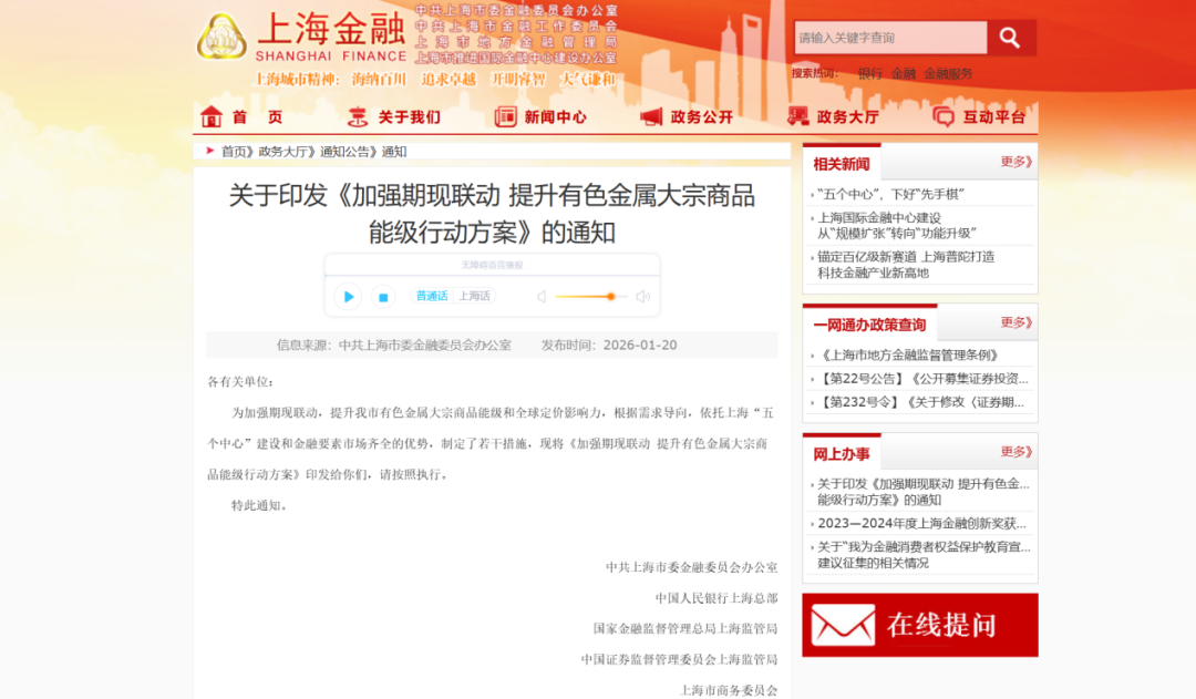 1 月 20 日,中共上海市委金融委员会办公室、中国人民银行上海总部、国家金融监督管理总局上海监管局、中国证券监督管理委员会上海监管局、上海市商务委员会联合发布 《加强期现联动提升有色金属大宗商品能级行动方案》(以下简称 《行动方案》),提升上海市有色金属大宗商品能级和全球定价影响力。