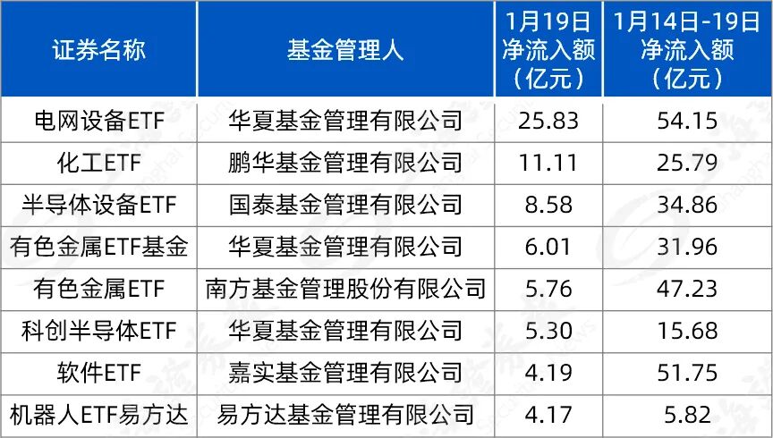 1 月 19 日,华夏电网设备ETF 净流入 25.83 亿元,鹏华化工 ETF 净流入 11.11 亿元,国泰半导体设备 ETF、华夏有色金属ETF、南方有色金属 ETF、华夏科创半导体 ETF 等净流入均超 5 亿元。