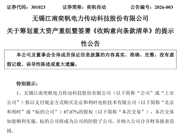 奕帆传动(301023)1 月 20 日晚间公告,公司拟以支付现金方式购买北京和利时电机技术有限公司 (简称 「北京和利时」)87.07% 的股权,本次交易如能顺利实施,北京和利时将成为公司的控股子公司,并纳入公司合并财务报表范围。