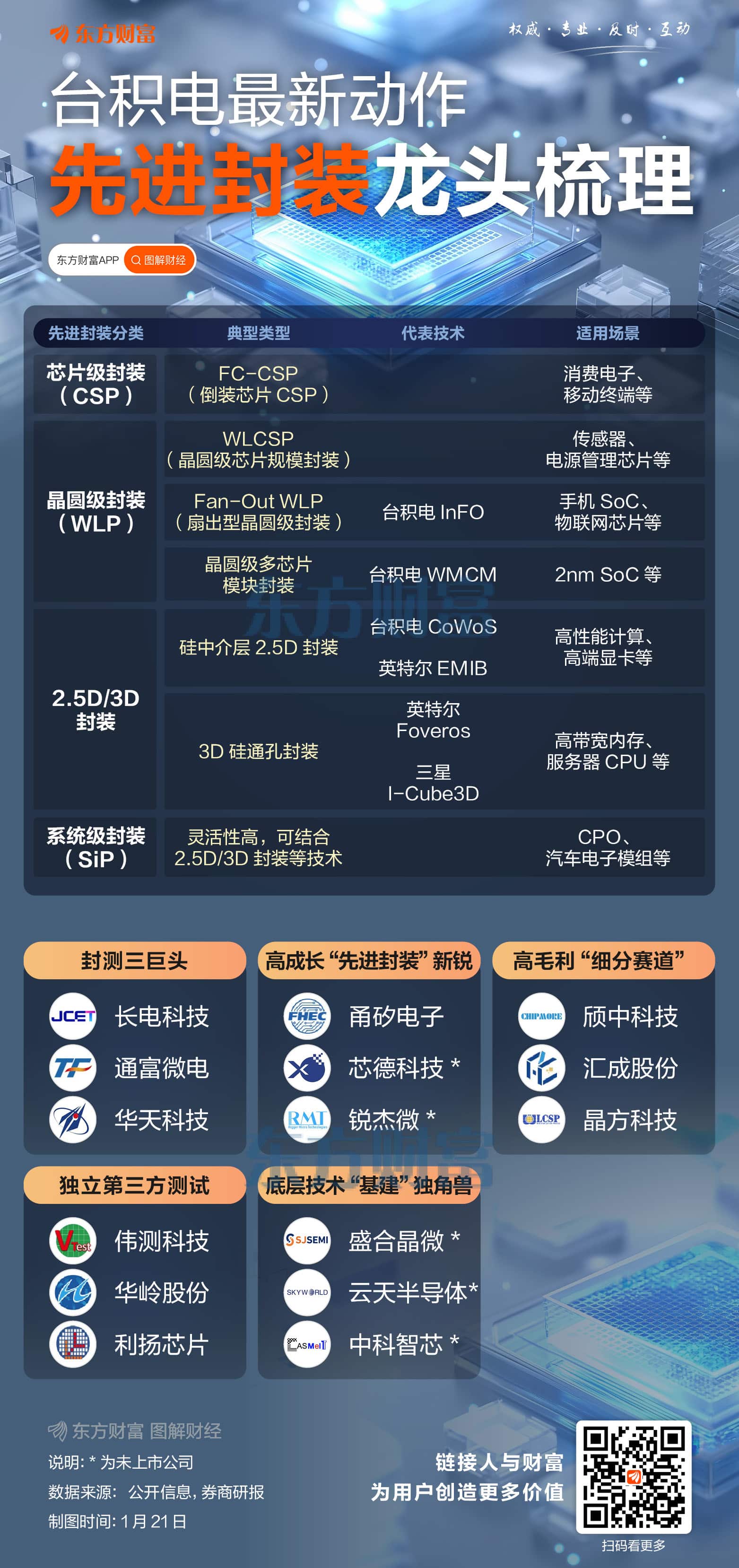 先进封装板块 1 月 21 日表现强势,通富微电、华天科技涨停;科翔股份、利扬芯片大涨超 10%。