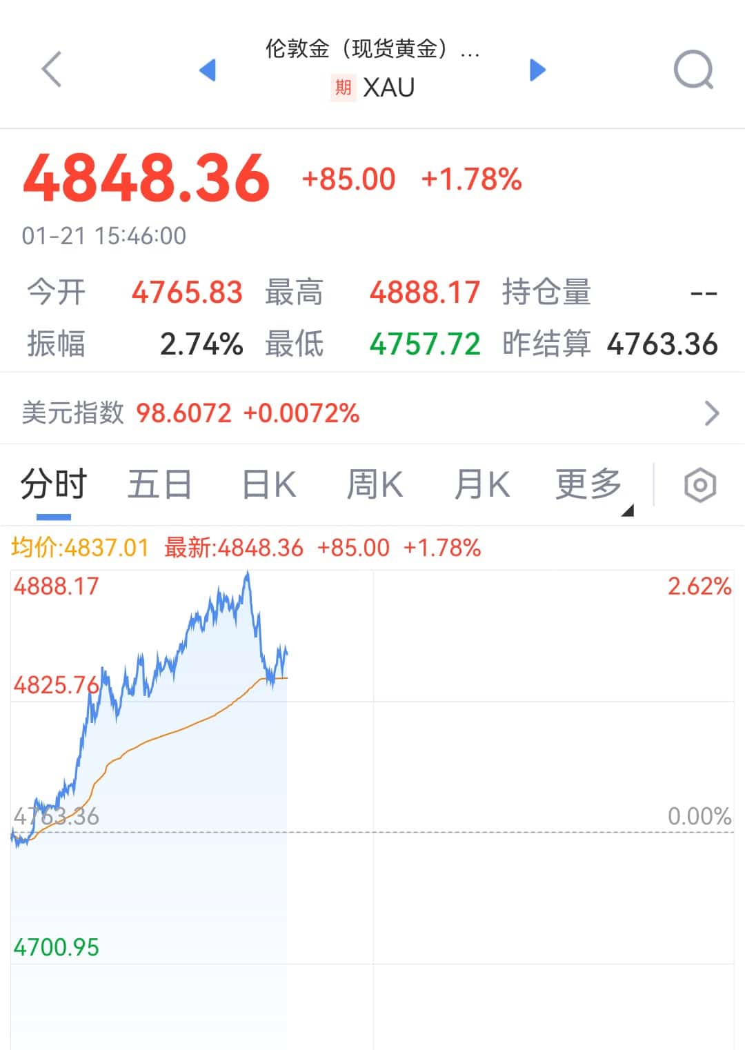 1 月 21 日,伦敦金价格开盘后一路走高,一度触及 4888.17 美元/盎司,再创新高,随后直线下跌。与此同时,当日沪金期货主力合约 2604 在突破 1100 元/克后也开始回落,收盘报 1092.3 元/克。