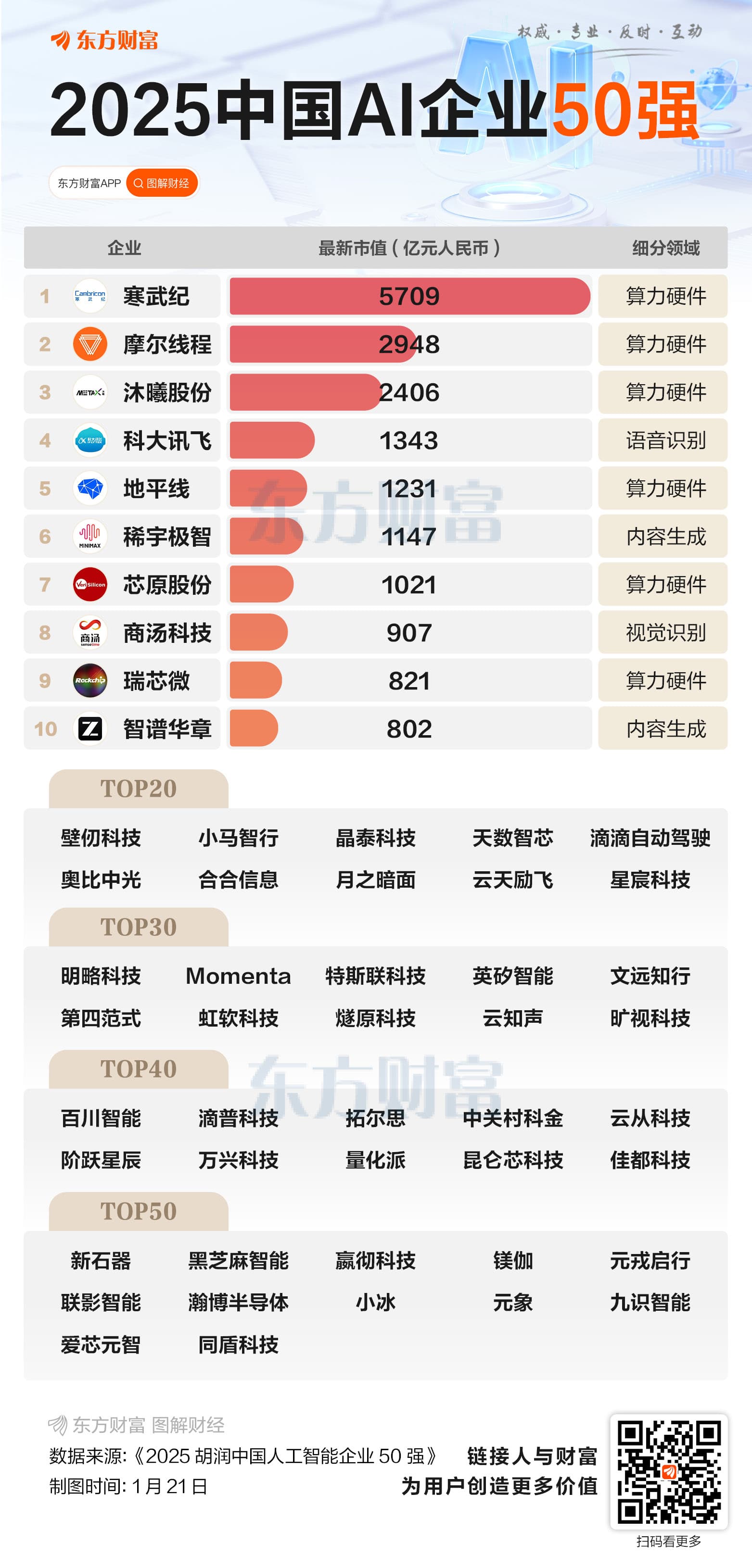 在这 52 家企业中,按 1 月 21 日最新市值,专注于 AI 芯片的寒武纪以 5709 亿元人民币估值位居榜首,摩尔线程、沐曦股份分别以 2948 亿元和 2406 亿元紧随其后。前十名中,算力硬件企业占据六席,总市值超过 1.4 万亿元,突显出在人工智能技术高速发展的当下,算力基础设施已成为产业竞争的制高点。