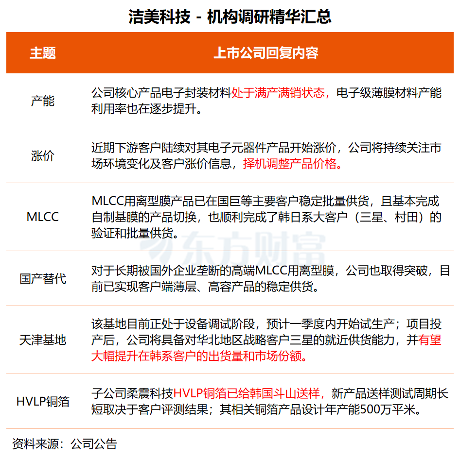 在调研中,洁美科技表示,目前行业景气度高,公司核心产品电子封装材料处于满产满销状态,电子级薄膜材料产能利用率也在逐步提升。