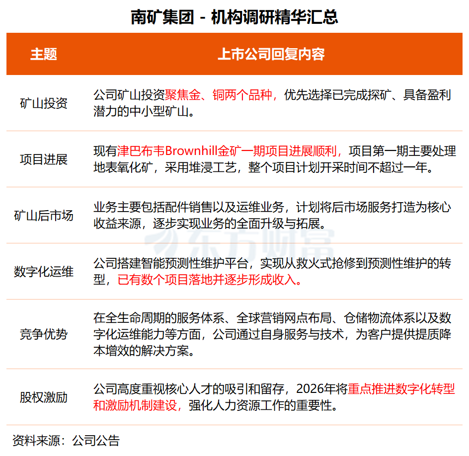 南矿集团昨日接受申万宏源、国海证券等 10 家机构调研。公司在调研中透露,津巴布韦 Brownhill 金矿一期项目进展顺利,项目第一期主要处理地表氧化矿,采用堆浸工艺,整个项目计划开采时间不超过一年。