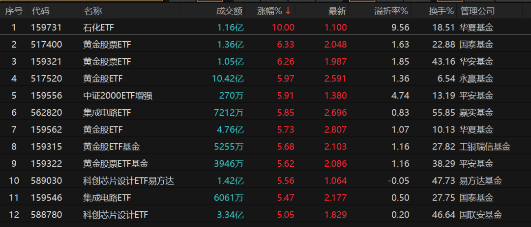 从 1 月 21 日 ETF 表现来看,黄金股主题 ETF、集成电路主题 ETF、科创芯片主题 ETF 等表现十分抢眼。值得注意的是,由于资金涌入,多只 ETF 出现较大幅度溢价。其中,由于临收盘大单买入,华夏石化 ETF 涨停,目前溢价率超过 9%。