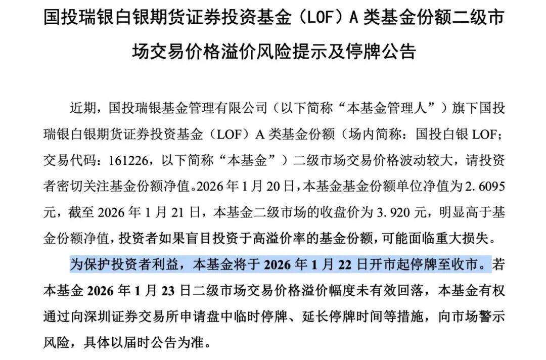 1 月 21 日晚间,国投白银 LOF 基金 (以下简称"本基金") 发布公告称,为保护投资者利益,本基金将于 1 月 22 日开市起停牌至收市。若本基金 1 月 23 日二级市场交易价格溢价幅度未有效回落,本基金有权通过向深交所申请盘中临时停牌、延长停牌时间等措施,向市场警示风险。
