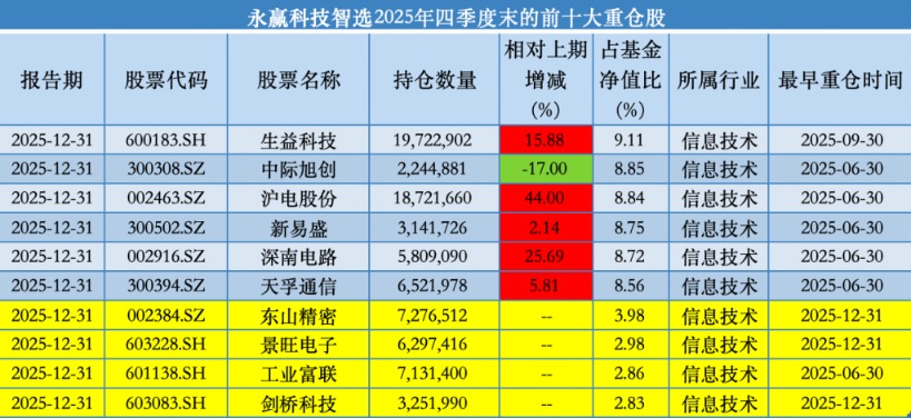 具体来看,2025 年四季度期间,永赢科技智选的持仓前十更迭了 4 只个股,前十大重仓股依次为:生益科技(600183.SH)、中际旭创(300308.SZ)、沪电股份(002463.SZ)、新易盛(300502.SZ)、深南电路(002916.SZ)、天孚通信(300394.SZ)、东山精密(002384.SZ)、景旺电子(603228.SH)、工业富联(601138.SH)、剑桥科技(603083.SH)。