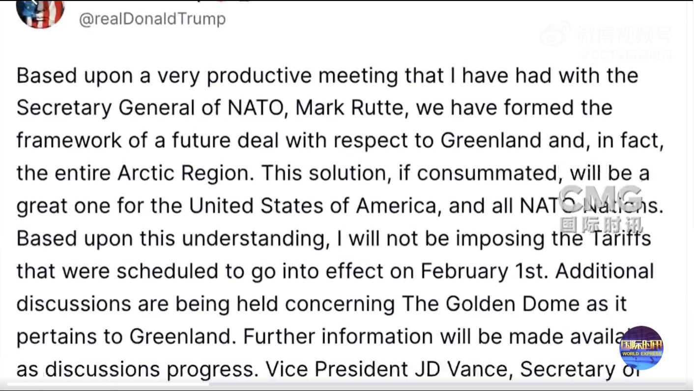 据央视新闻,当地时间 1 月 21 日,美国总统特朗普在其社交媒体 「真实社交」 发文称,基于他与北约秘书长马克·吕特的会晤,他们已经就格陵兰岛乃至整个北极地区的未来合作框架达成了一致。如果这项方案最终得以落实,将对美国和所有北约成员国都大有裨益。特朗普表示将不会实施原定于 2 月 1 日生效的关税措施。