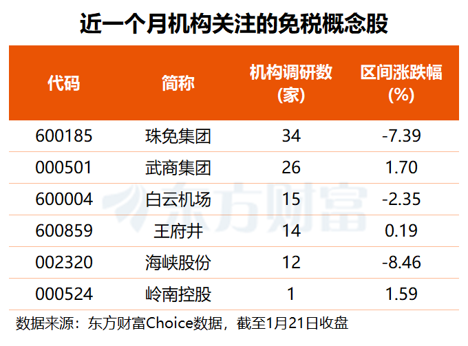 机构关注度方面,近一个月,共有 6 只免税概念股获得机构调研,珠免集团共获 34 家机构关注,武商集团获 26 家机构集中调研,王府井、白云机场、海峡股份的机构调研数均超 10 家。