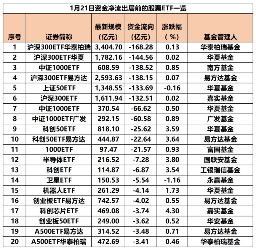 1 月 21 日,A 股主要指数集体收涨,贵金属、采掘行业等板块涨幅居前。股票 ETF 资金净流出超 990 亿元,沪深 300ETF、中证 1000ETF 等宽基 ETF 成为 「失血」 大户,合计净流出超千亿元,此外,电网设备、化工、黄金、半导体等热门主题 ETF 资金净流入居前。