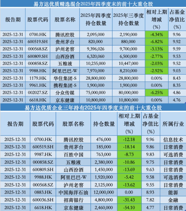 与上述两只基金类似的是,在 2025 年四季度,张坤旗下的易方达优质精选基金、易方达优质企业三年持有也并未更迭前十大重仓股,仅对部分个股进行了减持操作。