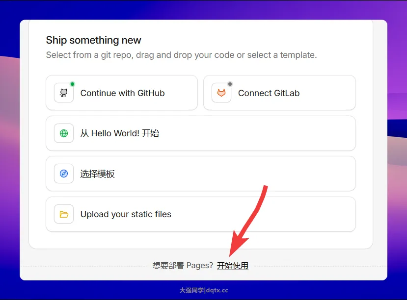 在页面的右上角点击 【创建应用程序】,然后点击下面的想要部署 Pages?的 【开始按钮】。如下