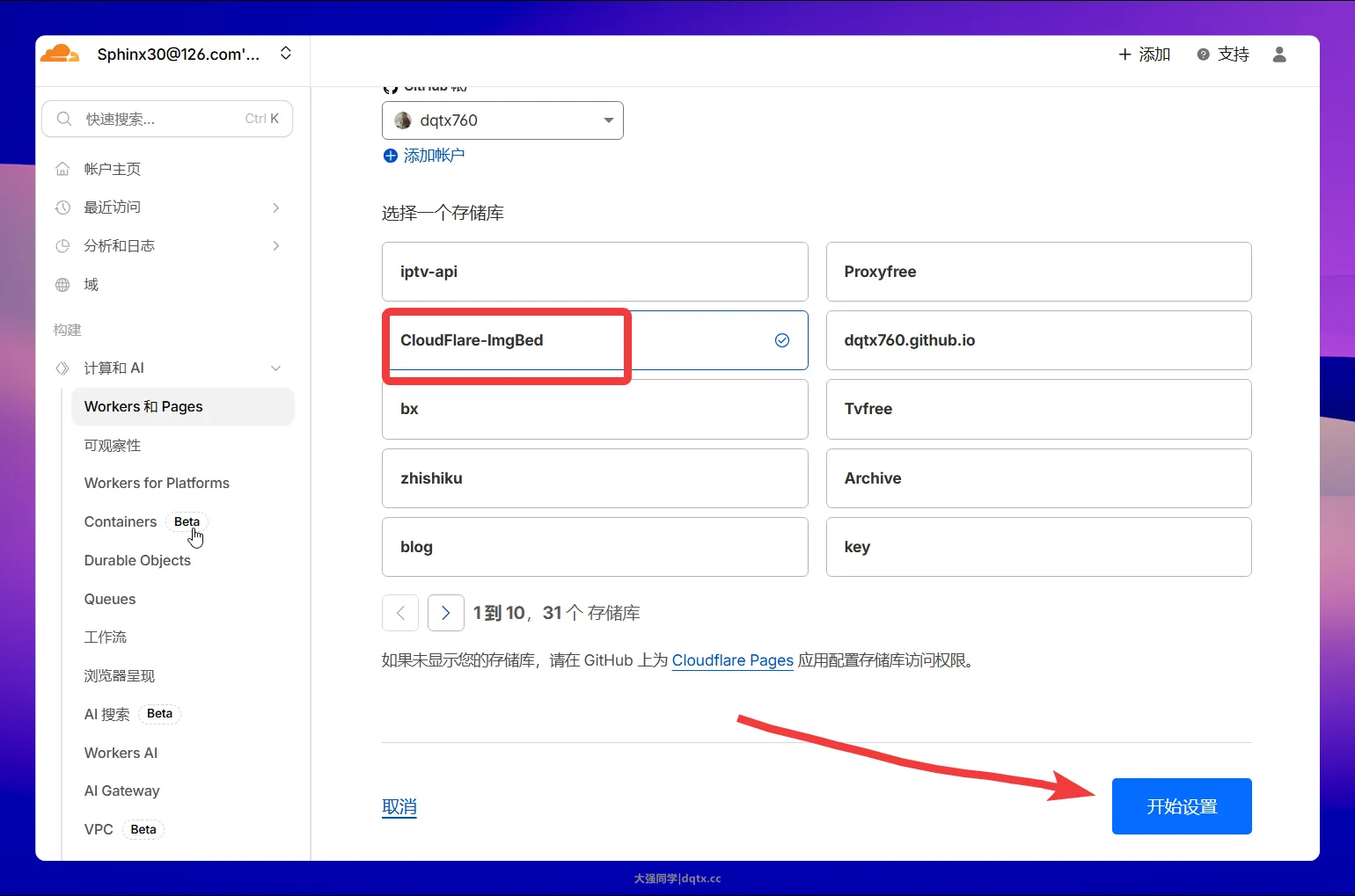 - 选择刚 Fork 的 「CloudFlare-ImgBed」 项目,点击 「开始设置」;
