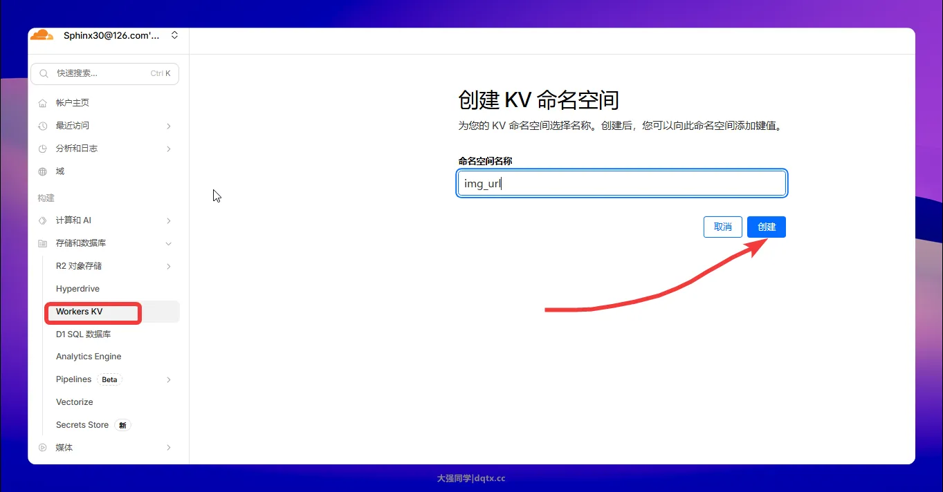 - 进入 Cloudflare「存储和数据库」→「Workers KV」,新建 KV 数据库,名称填