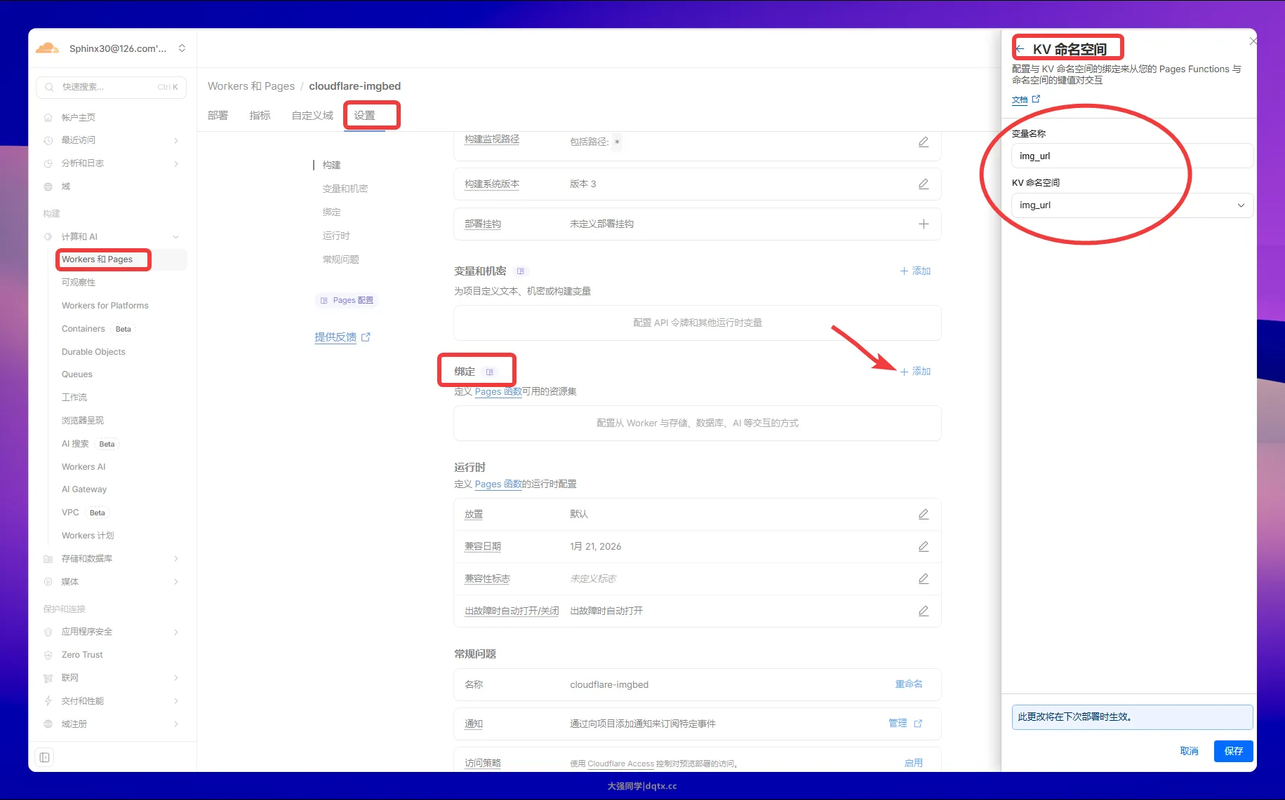 - 回到部署好的项目→「设置」→「绑定」,添加 KV 绑定:
