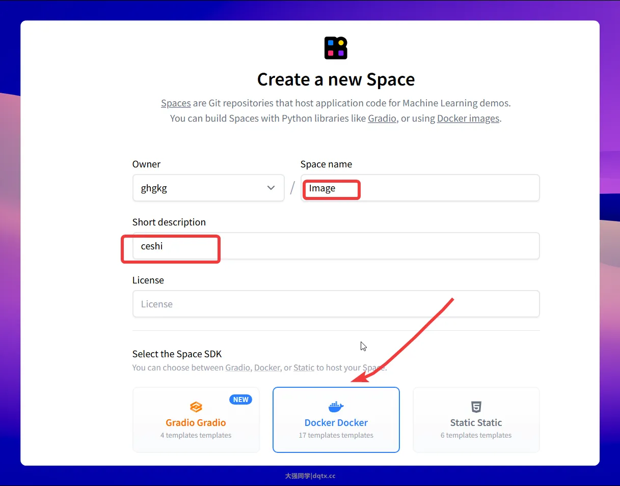 - 仓库名填 「HuggingFace 用户名 / 空间名」(如