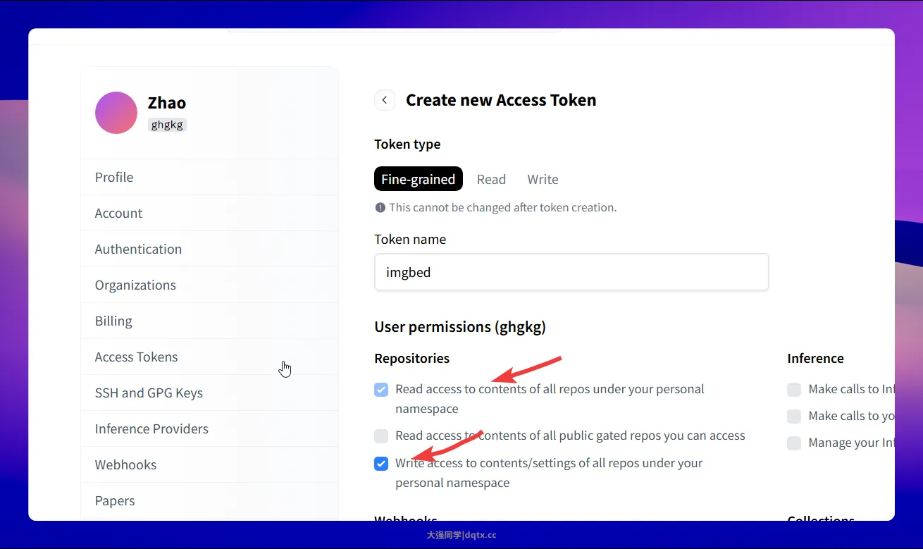 - 进入 HuggingFace「设置」→「Access Tokens」→「Create New Token」;