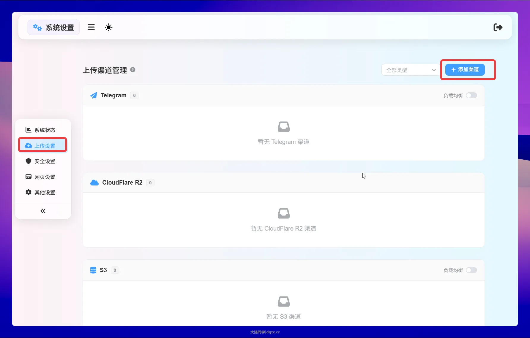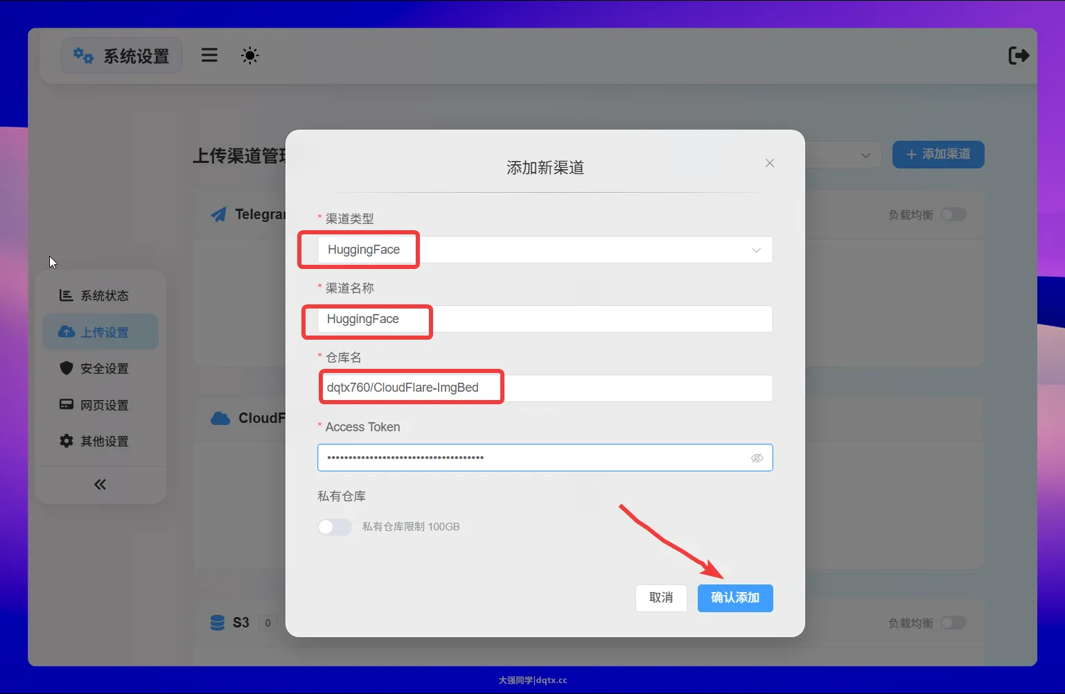 /dashboard(如https://你的域名/dashboard); - 进入 「系统设置」→「上传设置」,添加 HF 渠道: