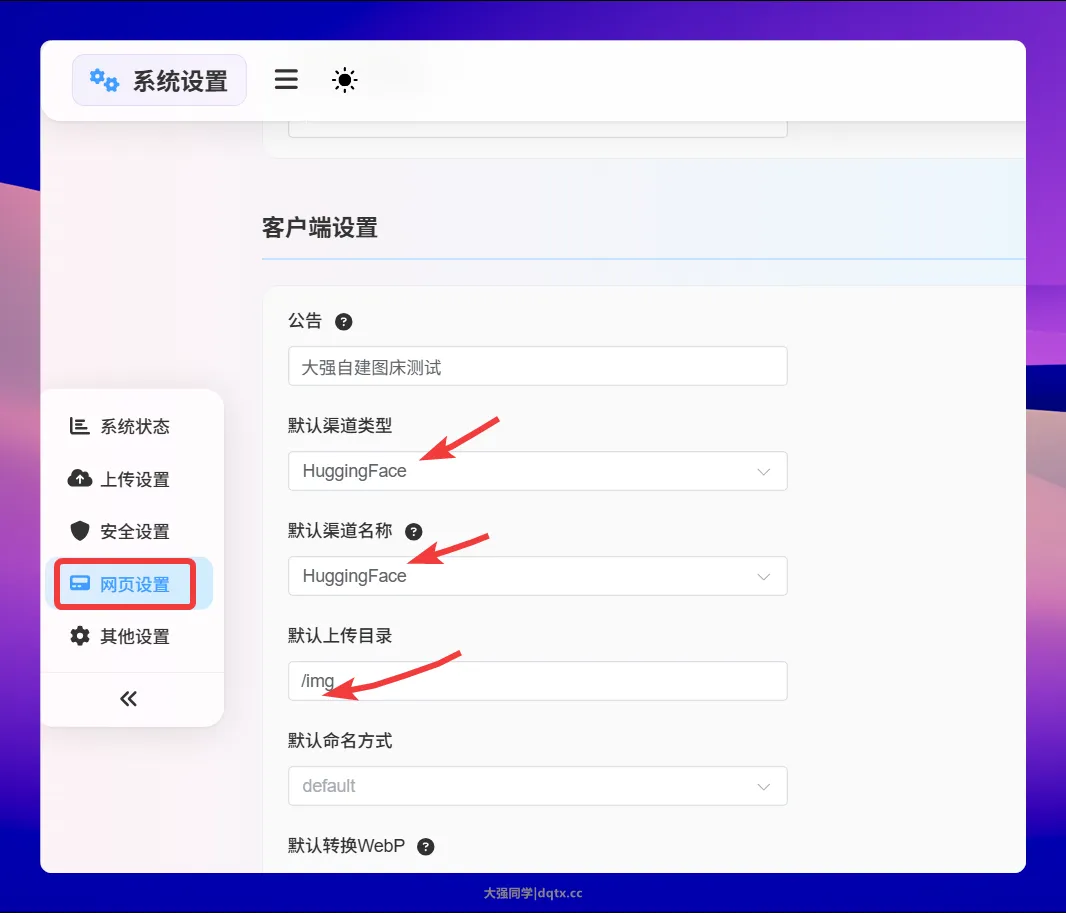 - 进入 「页面设置」→「客户端设置」,将默认上传渠道设为刚添加的 HF 渠道。