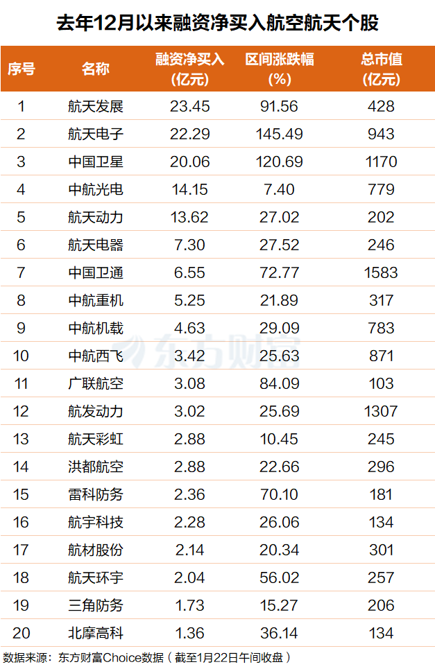 其中航天发展排名第一,融资净买入超 23 亿元;航天电子排名第二,融资净买入超 22 亿元。