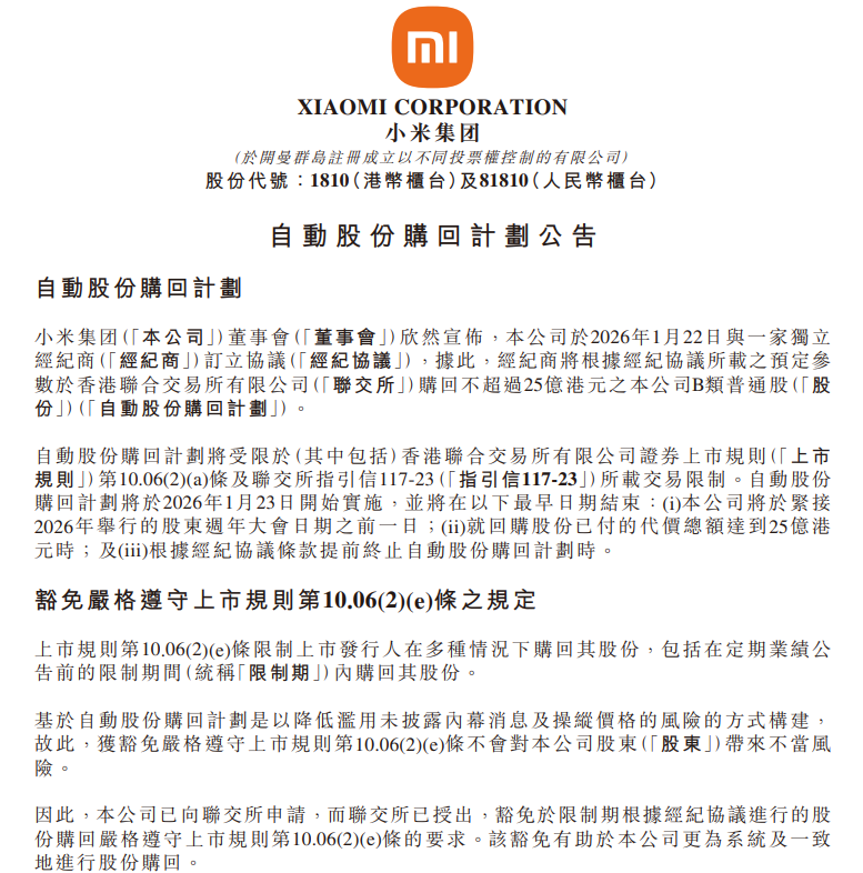 小米集团 1 月 22 日在港交所公告,公司于 2026 年 1 月 22 日与一家独立经纪商订立协议,据此,经纪商将根据经纪协议所载之预定参数于香港联合交易所有限公司购回不超过 25 亿港元之本公司 B 类普通股。