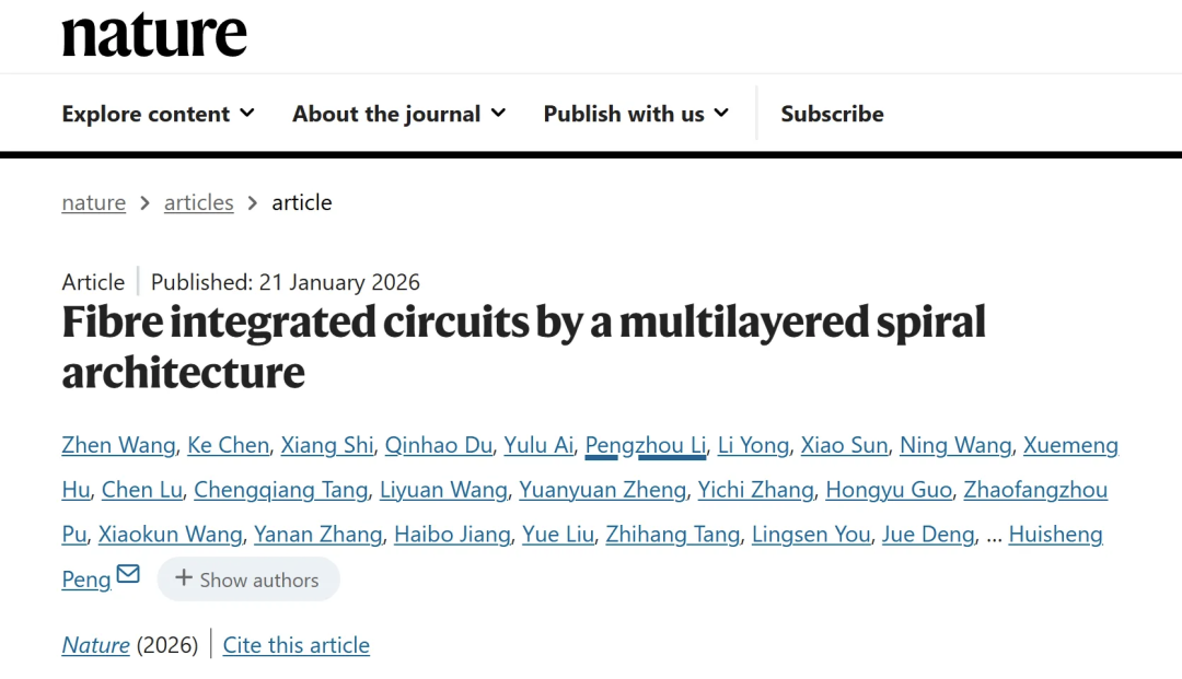 1 月 22 日,据复旦大学官微,复旦大学纤维电子材料与器件研究院、高分子科学系、先进材料实验室、聚合物分子工程全国重点实验室彭慧胜、陈培宁团队突破传统芯片硅基研究范式,近日率先提出并制备 「纤维芯片」,相关成果以 《基于多层旋叠架构的纤维集成电路》 为题于北京时间 1 月 22 日凌晨发表于国际期刊 《自然》(Nature)。