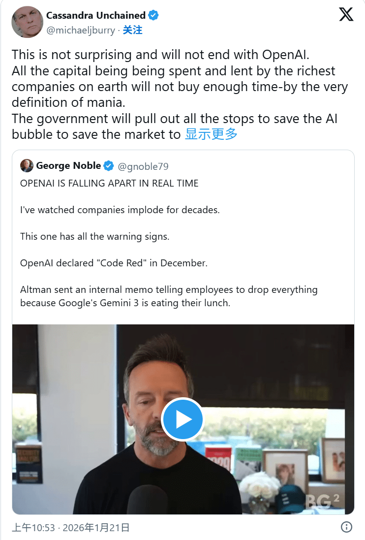 伯里于周二晚间在 X 平台发文称:「政府将竭尽所能挽救人工智能泡沫,进而挽救市场、挽救经济,但这个泡沫的体量已然过大,根本无力回天。」