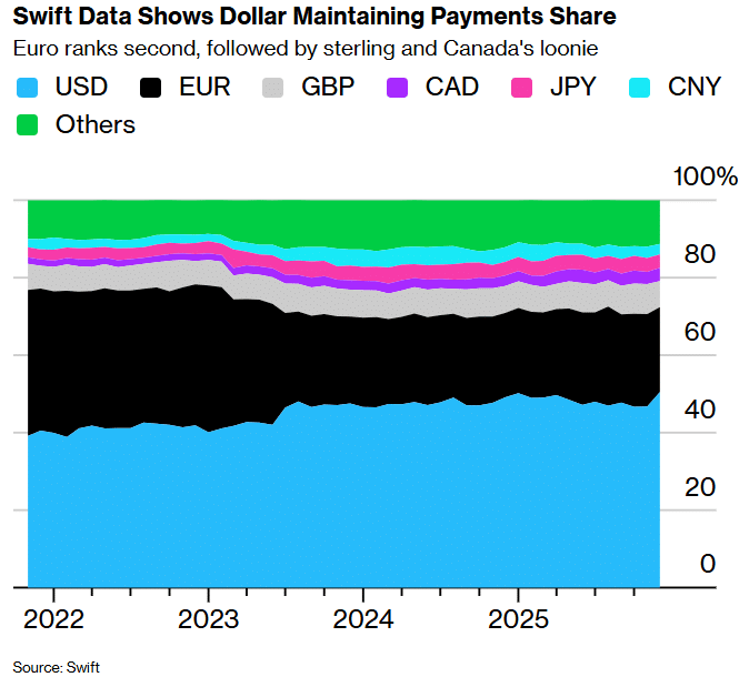 但这些数据支持了一个观点:尽管特朗普一年前上任以来引发了市场波动和更深层的政策混乱,美元在国际金融和贸易中的作用依然健康。美元在全球支付中的份额上一次突破 50% 是在 2025 年 1 月。与此同时,一项彭博美元指数在过去一年中下跌了超过 7%。